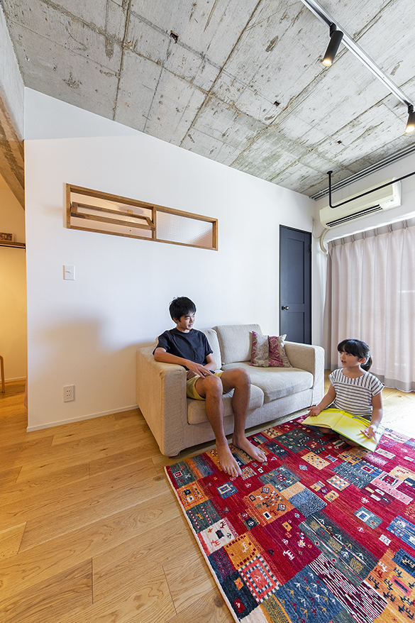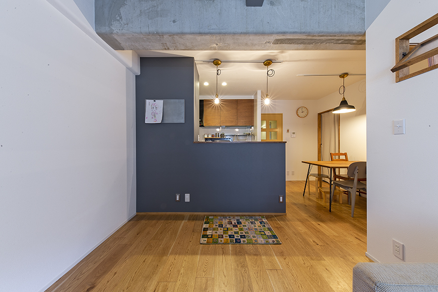 ネイビーのドアから入ります。子供部屋は天井までない壁で間仕切り、エアコンを共有しています。LDKのオークの床、剥き出しの天井もママの念願。気持ちのいいアートギャッベに、子供たちが集まります