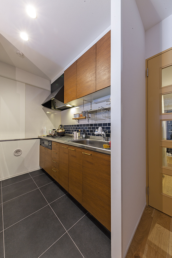 キッチンはそのまま、扉を替えるだけで雰囲気がガラリ。ラフな雰囲気が好きなママのために、壁の下地材として使うラワン材を扉に採用。真鍮の取手が映えます。そしてキッチンのタイルは…