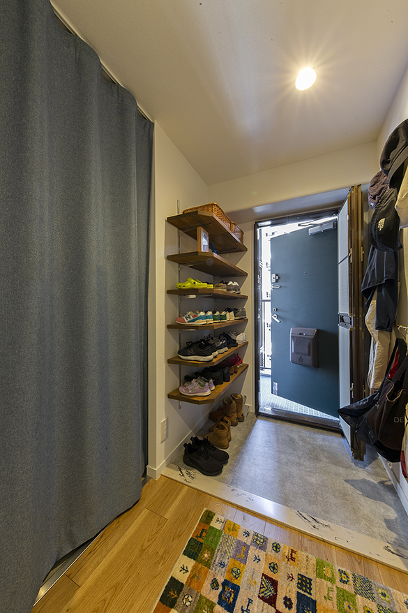 玄関は靴箱を取り払い、オープン棚を設置。もともとドアのなかった洗面室の開口部はカーテンに
