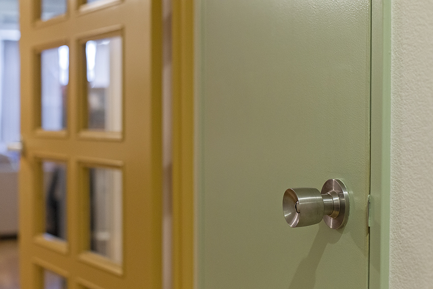 ドアはペイントして再利用。マスタードとモスグリーンの色が素敵です。「ドアの色など、1つ1つめちゃめちゃ悩みましたが、急かさず、『ゆっくり悩んでくださいね』と言ってくださったのが、うれしかったです」