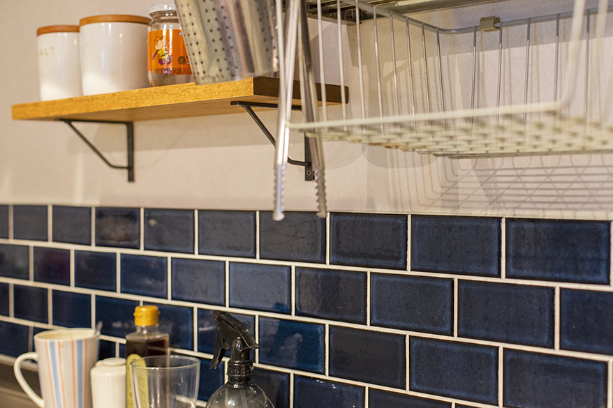 キッチンパネルの上から貼るアイデアでコストカット。「タイルはずっとやりたかったのですが、コストがかかると我慢していました。少し貼るだけでも、効果大です!」。キッチンアイテムを飾った木×アイアンのシェルフも、リノベならではです