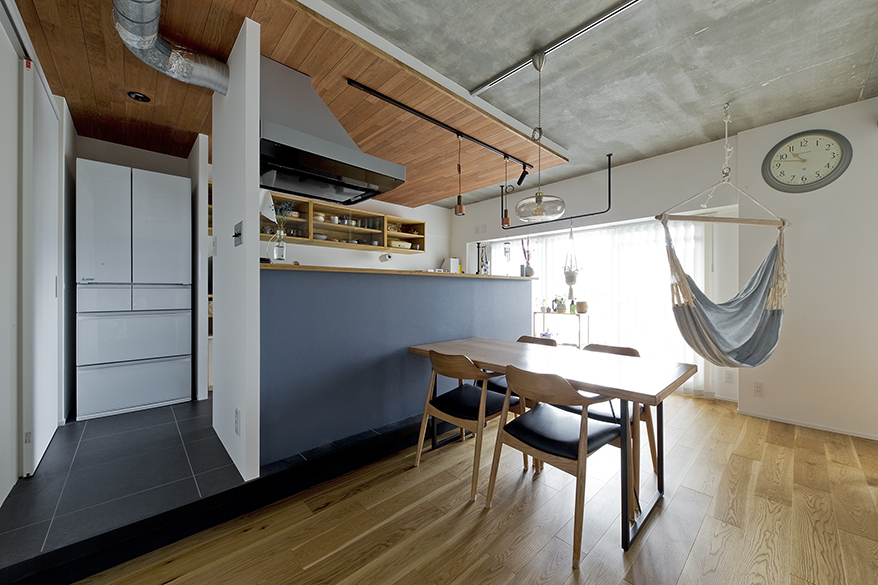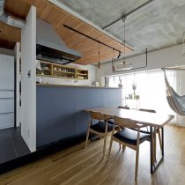 Kさんが最初に教えてくれたのは、夢ノートのお話でした。「37歳車購入」「38歳実家を出て子供と暮らす」「再婚本気!」「40代までに中古を買ってリノベする」。それがほんとうに、41歳の誕生日を迎える1週間前に、リノベが完成したというからすごいです。 Kさんは夢を叶える力を持っていて、自然とまわりを巻き込むというか、うまく回るというか。それは、マンション探しにも発揮されます。Kさんが目をつけたマンションの所有者が実はママ友で、彼女は偶然にも宅地建物取引士の免許を持っていました。Kさんはママ友に少し安くしてもらって、直接売買。もう、マンガみたいで笑っちゃいます。そして、念願のリノベーションです。ここの間取りは少し変わっていて、動かせない浴室が真ん中にドーンとあり、LDが少し広すぎます。そこで、浴室横にあった独立型キッチンをLDへと大移動。高い位置から外の景色やリビングが見渡せるステージキッチンの誕生です。「このマンションは風通しがいいから、抜けるようにしたらいいですね」とのアドバイスから、1本目は玄関→廊下→LDK、2本目は玄関→WIC→洗面室→キッチンと、ズドーンと風が抜ける2つの動線を確保しました。「浴室を中心にくるくる回れるこのプラン、生活に合っているなあと、しっくりきます。キッチンからの見晴らしが良くて、本当に気持ちがいい。料理得意ではなかったけれど、今は料理が楽しいです」とKさん。そうそう、「再婚本気!」もリノベ前に実現し、現在夫は単身赴任中。「私は子どもとの時間が大切。彼も自分の時間が大切。だから、この家にいる時は4人一緒にいることを楽しんでいます」。次は、どんな夢が叶うのかな。