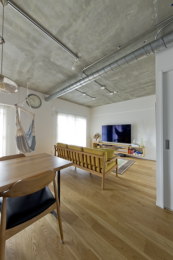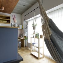 リビングにはフロートタイプのTV台を造作しました。ハンモックは夫の要望で、「ハンモックに包まれて、何も考えずにボーッとしているのが好きです」とお気に入り。窓は二重サッシに刷新し、「冬でもエアコンいらず。あったかいです」と好評です