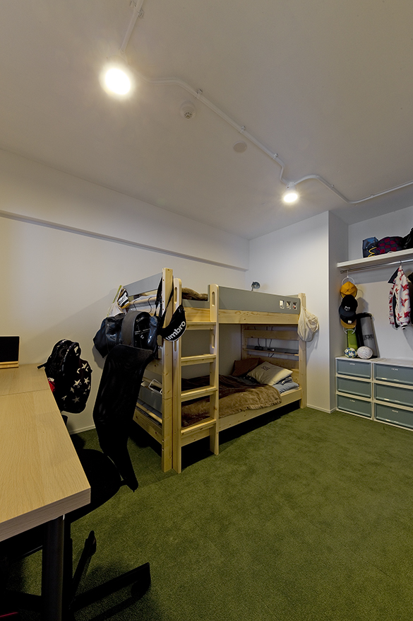 子ども部屋のオープンクロゼットです。寝室と子ども部屋で凸凹と取り合っているのがわかりますね。この子ども部屋、将来2つに間仕切ることができるように、2つドアをつくりました。「リビングで勉強していたお兄ちゃんが自分のスペースができてうれしいみたいで、扉を開けてここにこもっています。弟はLDKでトレーニングに励む毎日」