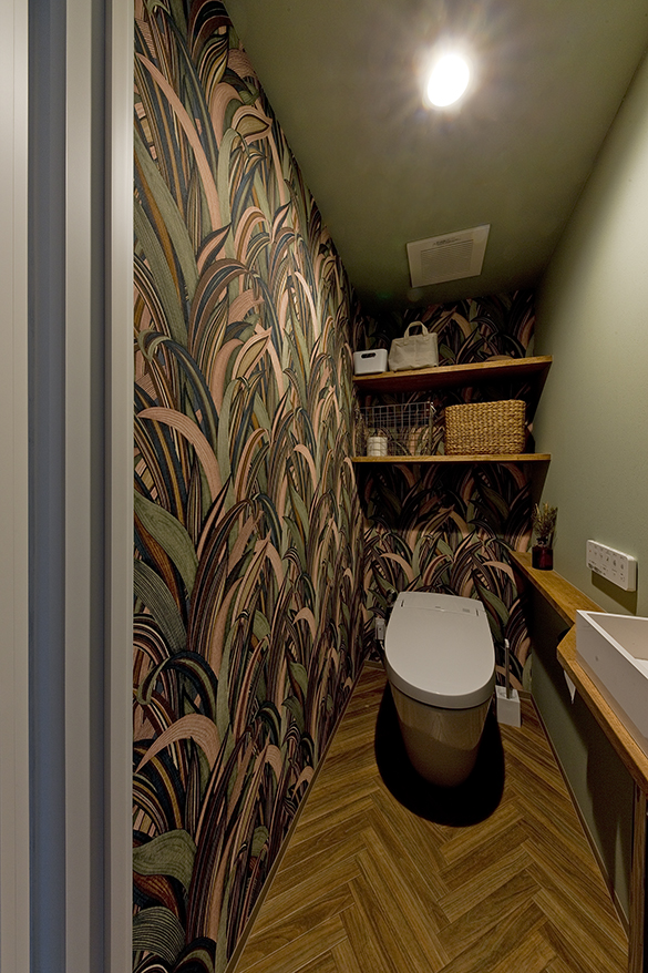 「ほかの部屋は落ち着いた空間ですが、トイレだけ遊び心を出そうと決めていたんです」と、WALPさんで選んだ輸入壁紙。植物が好きな夫と相談し、ボタニカルっぽい大柄にモスグリーンを合わせた壁紙をチョイス。ヘリンボーンの床材と合ってますね、素敵です