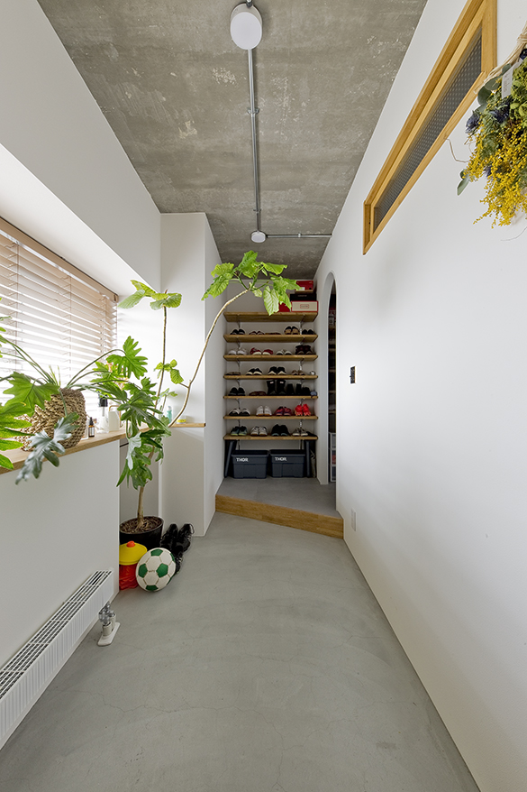 部屋を1つ潰して、玄関とWICをつくりました。出窓は室外機置き場と収納です。「土まみれのスパイクで帰ってくる子どもたち。玄関は『気』を招き入れる場所だし、キレイに保ちたいので広くしました」。そして最後に。シンプルハウスを選んだ理由は?「ネットで探してシンプルさんの相談会へ。夫はオンラインでの参加でした。ヌー茶屋町店は家具の雰囲気もよく、私たちの理想が叶いそう、という期待がありました。将来のことまで一緒に考えてくれた姿勢も心強かったです」