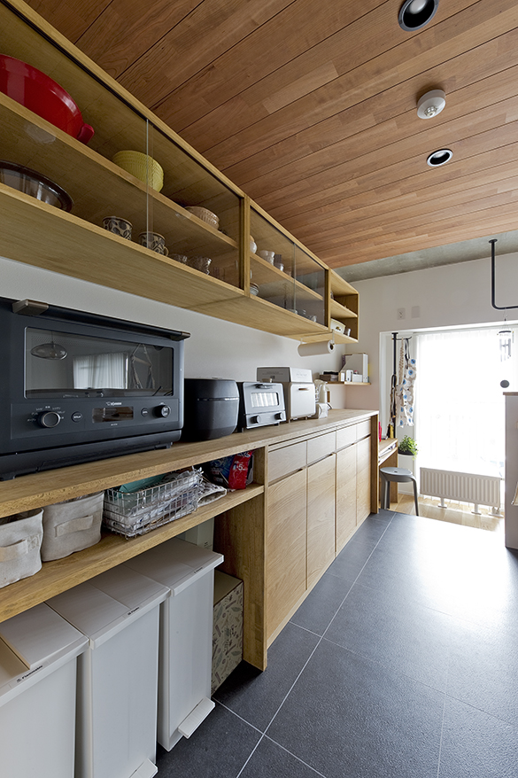 上の吊り戸棚は水屋風に造作。「ガラスの手がかりはガラス屋さんに掘っていただきました」。下はフレームだけ造作して、無印良品の家具やゴミ箱がスポッと収まります。ダウンライトはスピーカー付き。音楽と料理が楽しめます。窓際にはKさんのためのデスクもつくりました