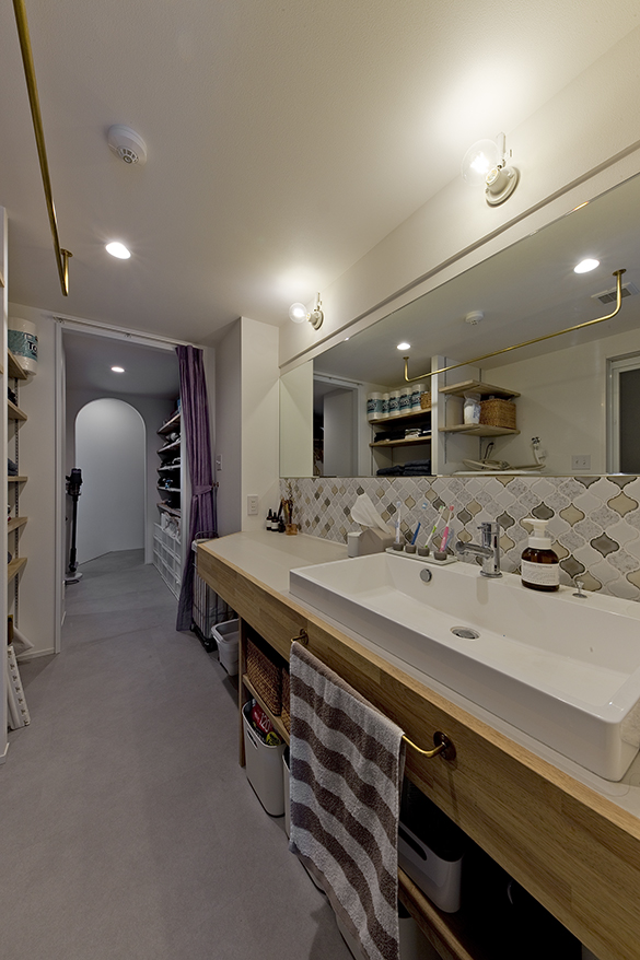 キッチンがなくなった分、浴室と洗面室は広くゆったり。玄関からアーチ開口を抜けるとWIC、洗面室、キッチンへと続きます。洗面室は2人並べるワイド感。鏡は2050mm!コラベルタイルがかわいいですね。アイアンバーやタオルハンガーなどは真鍮でまとめました。「子どもが脱ぎ散らかすから、洗面室は広くて正解です」
