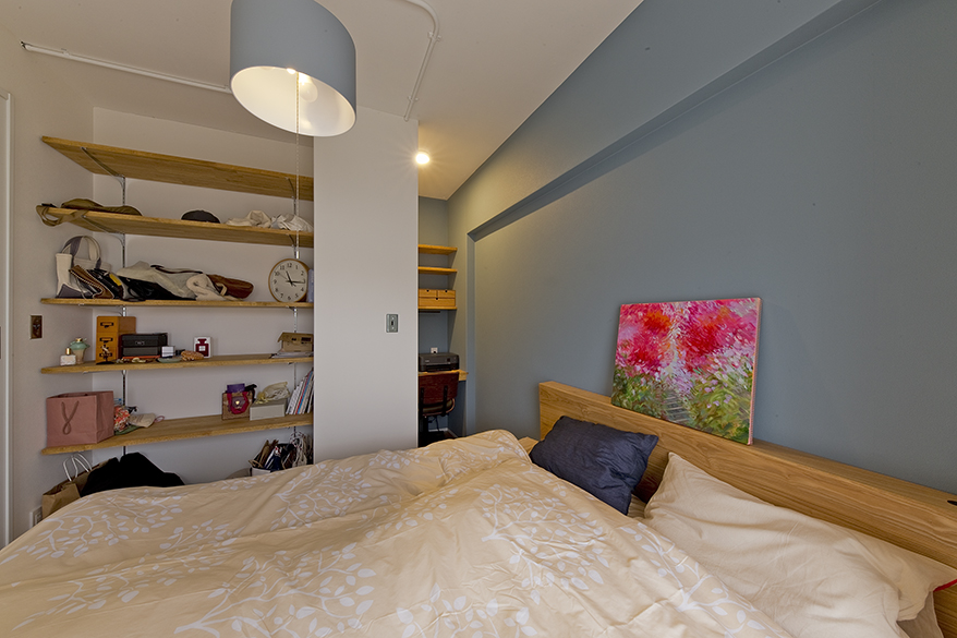 ブルーグレーでまとめた寝室。夫のリクエストでSOHOをつくりました。「このこもり感、仕事に集中できますね。リビングからも遠いので、すごく静かです」。実はここ、洋室のクロゼットだった場所で半分がこのSOHO。残り半分は…