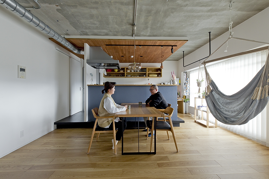 広すぎたLDにキッチンを大移動。蹴込みを入れたステージキッチンに板張りの天井を低くすることで、こもり感を演出しました。「正直、プランの段階ではこのステージ感のよさがわからなくて。でも、実際にこのキッチンに立ってみると、『これが田口さんが言っていた景色か』と納得しました」